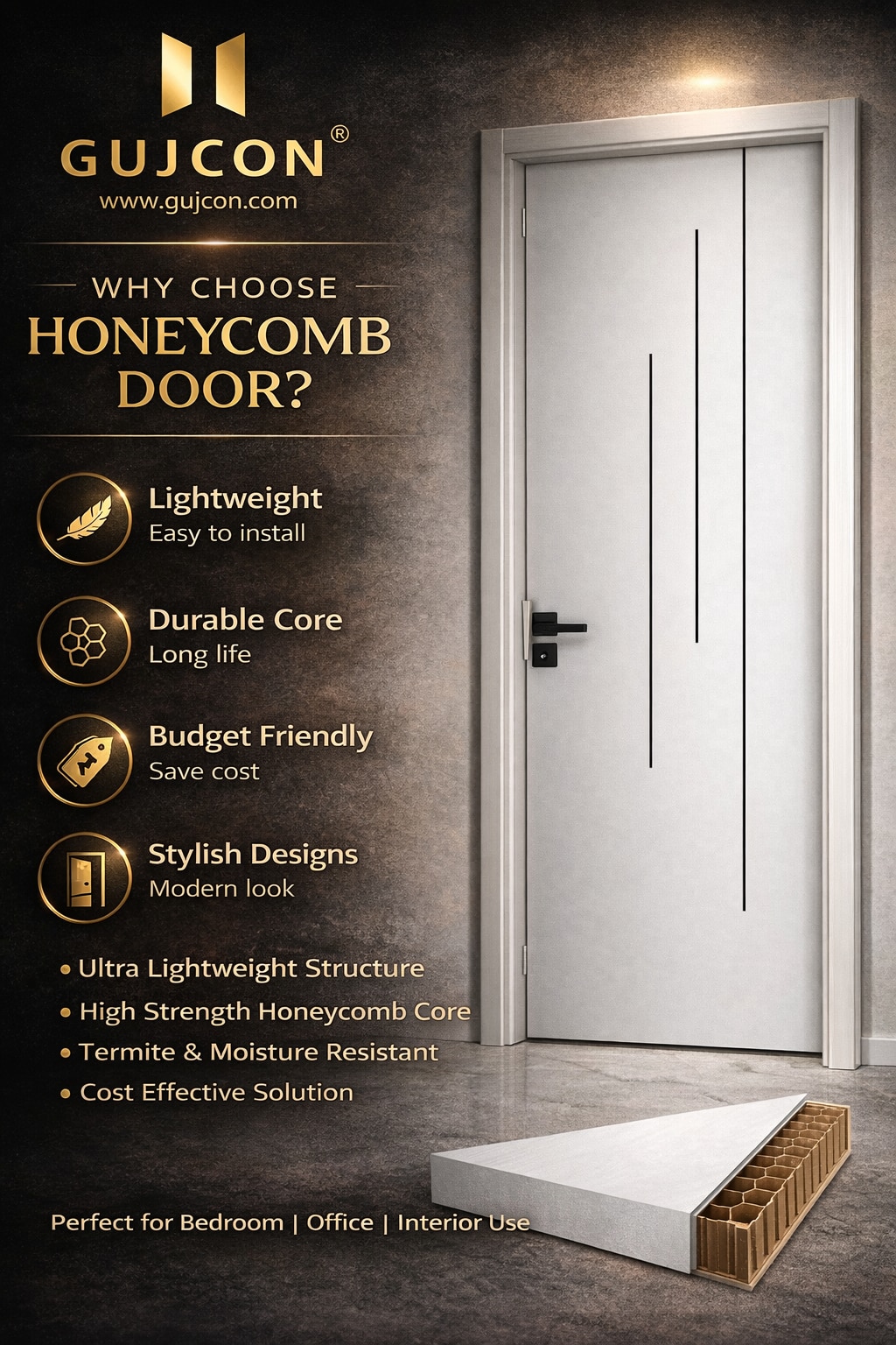 🟫 GUJCON Honeycomb Door Product Description Upgrade your interiors with GUJCON Honeycomb Doors — a perfect combination of lightweight structure, modern design, and long-lasting performance. Designed with advanced honeycomb core technology, these doors offer excellent strength while remaining easy to handle and install. The minimal groove line design adds a sleek and elegant touch, making it ideal for modern homes, apartments, and commercial spaces. With a smooth finish and premium look, GUJCON doors enhance the overall aesthetic of any interior. ✨ Key Features Ultra Lightweight – Easy to handle & install Strong Honeycomb Core – High durability with less weight Modern Simple Design – Clean groove line patterns Premium Finish – Smooth surface with elegant texture Termite & Moisture Resistant (optional if applicable) Low Maintenance – Long-lasting performance