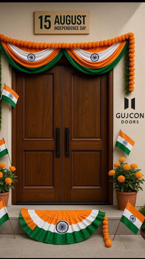 Transform your home’s entrance into a symbol of pride and elegance this Independence Day! GUJCON DOORS presents a stunning, realistic entrance door beautifully adorned with traditional tricolor bunting, vibrant marigold flowers, and Indian flags—perfect for welcoming freedom and festivity into your home. Discover our quality craftsmanship and make every celebration memorable. ✨ Proudly made for every Indian home. #IndependenceDay #GUJCONDoors #HomeDecor #CelebrateIndia 🎉👏💥🔥💪